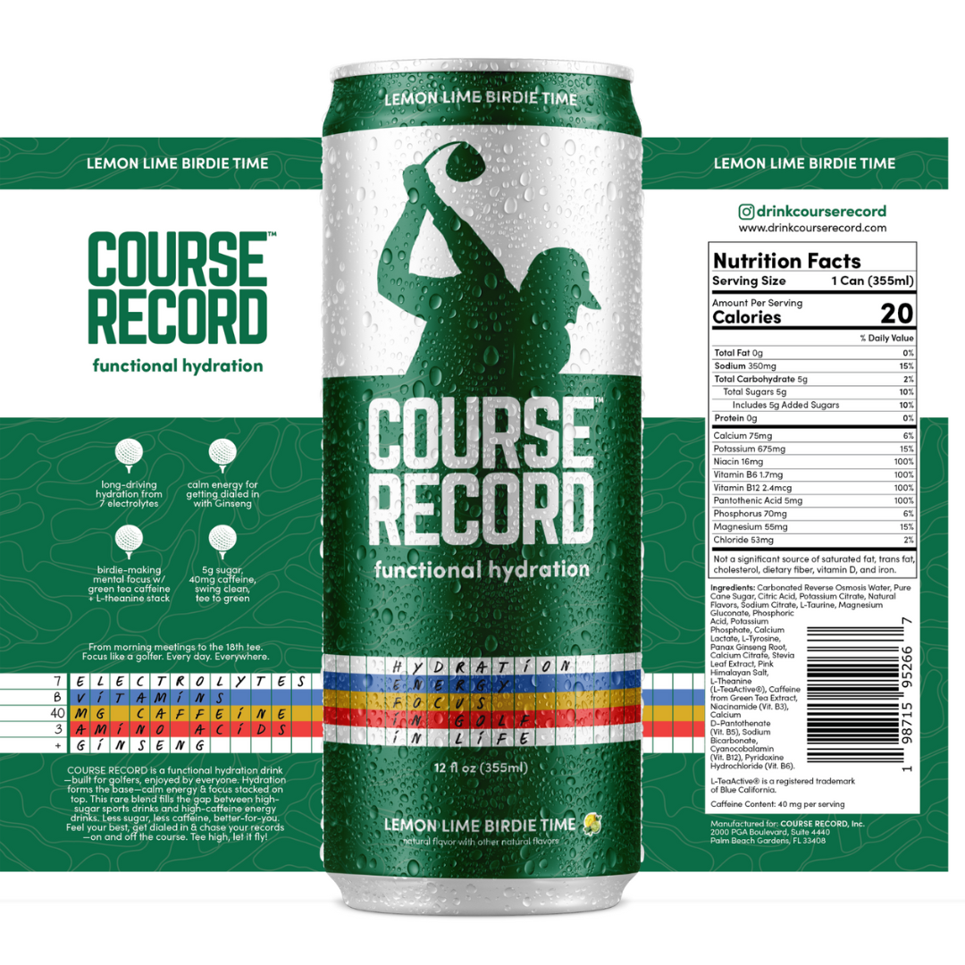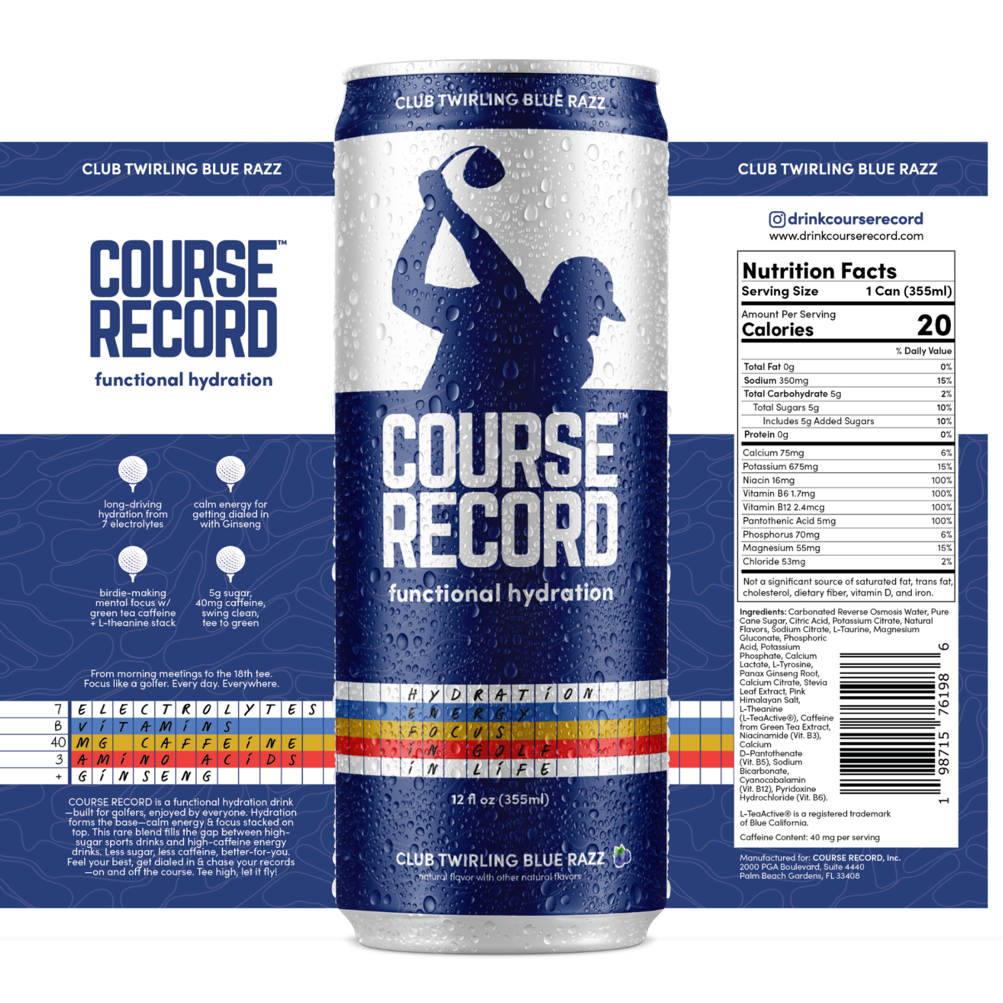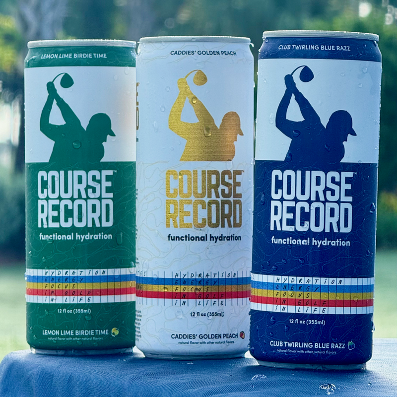 COURSE RECORD's functional hydration drink fills "the beverage cart gap" between high-sugar sports drinks and high-caffeine energy bombs, with a rare blend of hydration, calm energy & focus formulated for the unique needs of golfers. Less sugar, less caffeine, better-for-you.