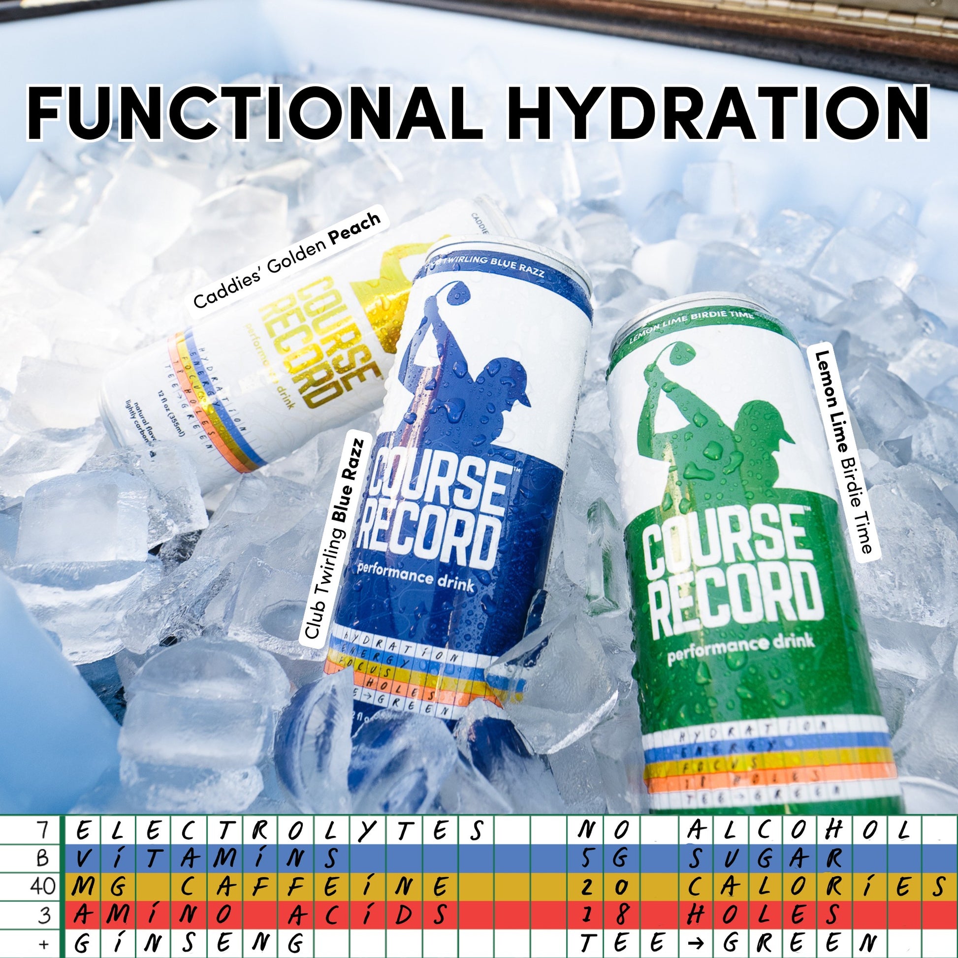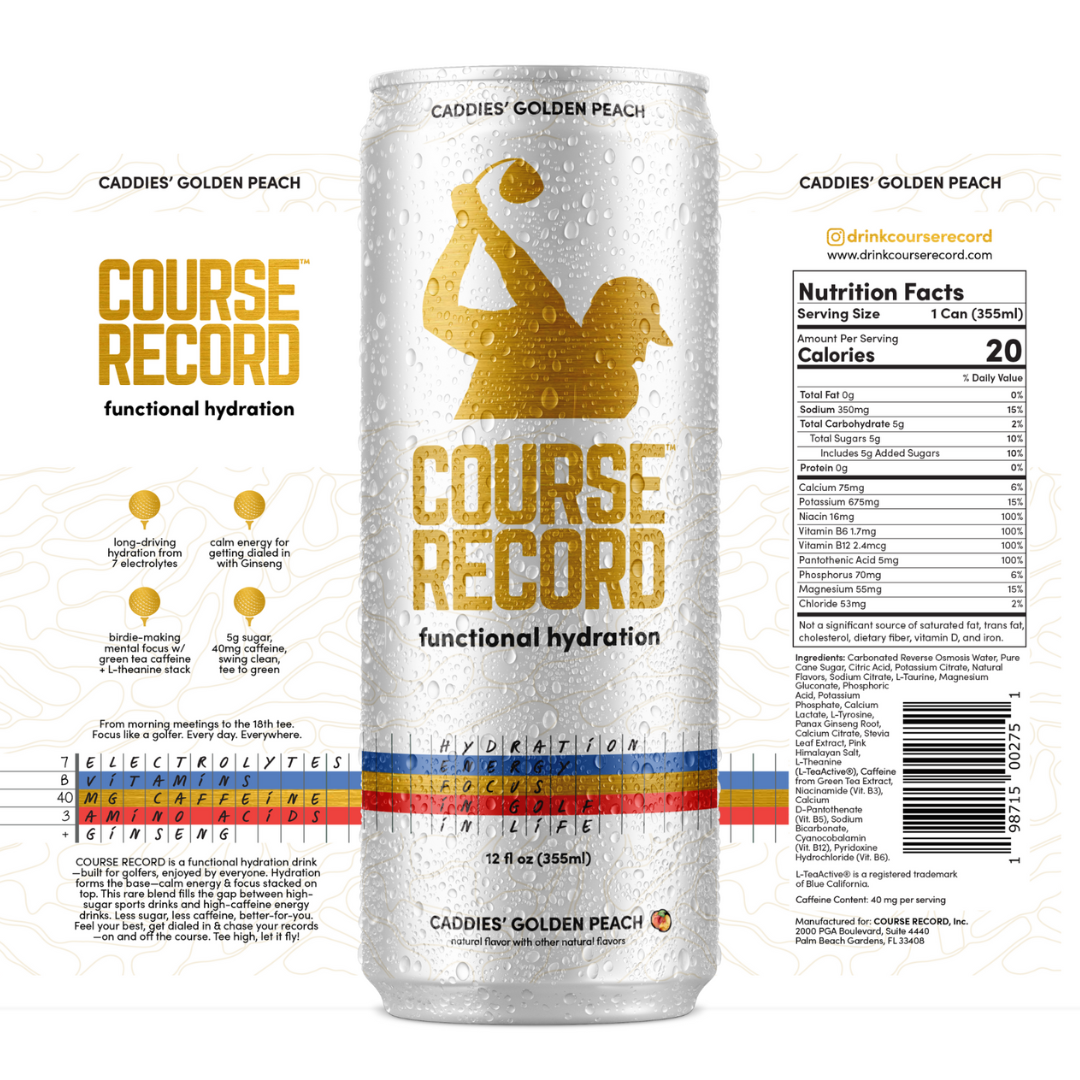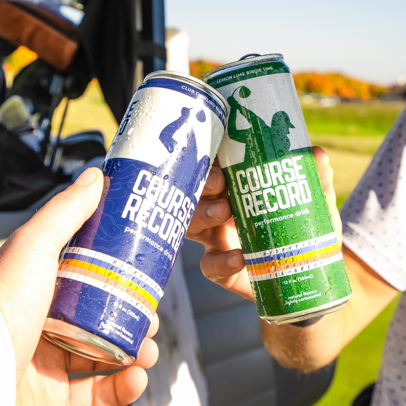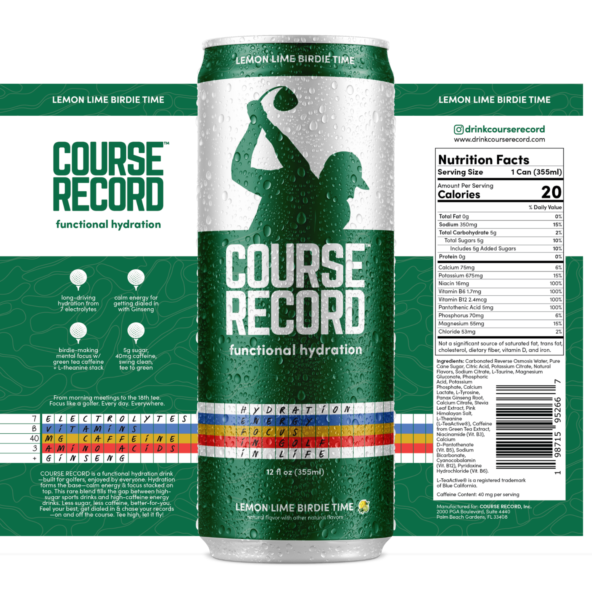 COURSE RECORD's functional hydration drink fills "the beverage cart gap" between high-sugar sports drinks and high-caffeine energy bombs, with a rare blend of hydration, calm energy & focus formulated for the unique needs of golfers. Less sugar, less caffeine, better-for-you.